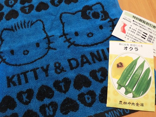 キティタオルと植物の種、斎藤清美術館の割引券 |