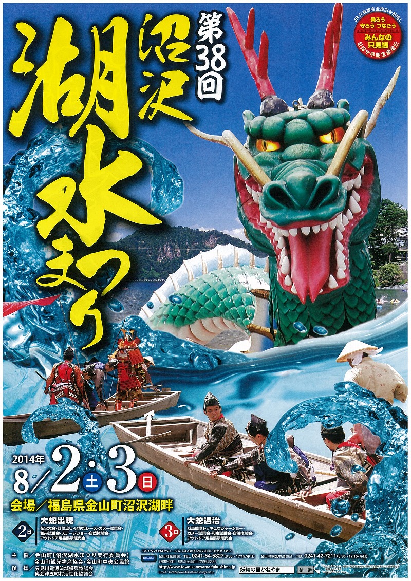 大蛇伝説のある沼沢湖にて大蛇伝説を模した「沼沢湖水まつり」が開催されます。 1日目は大蛇が出現する花火大会、翌日には大蛇を退治した佐原十郎義連と大蛇の対決を再現。 金山町ならではのイベントですよ~!! |