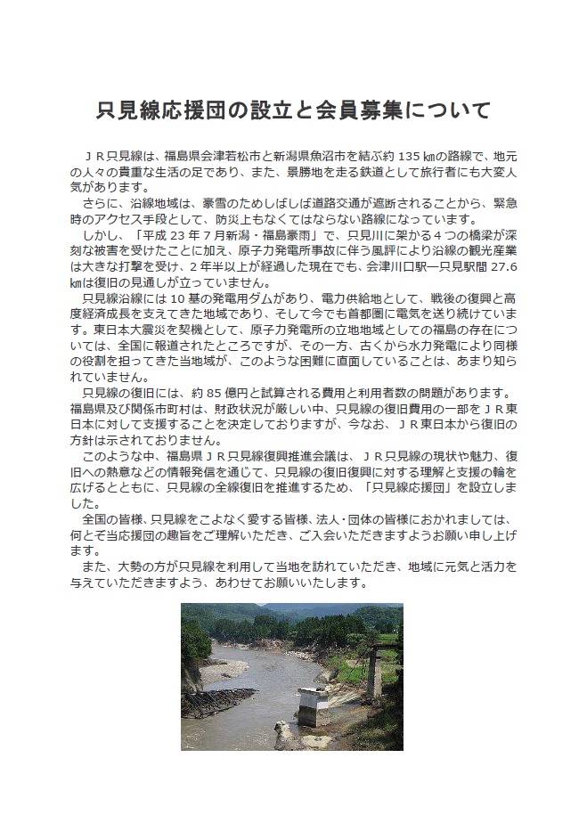 東日本大震災と平成23年7月新潟・福島豪雨により甚大な被害を受け、未だ全線復旧の見通しが立っていないJR只見線の 復旧を願う地域住民や自治体をはじめ関係団体、さらには只見線の復旧に心を寄せていただける全国に方々と共に只見線を 応援するため、只見線応援団の会員を募集しています。 |