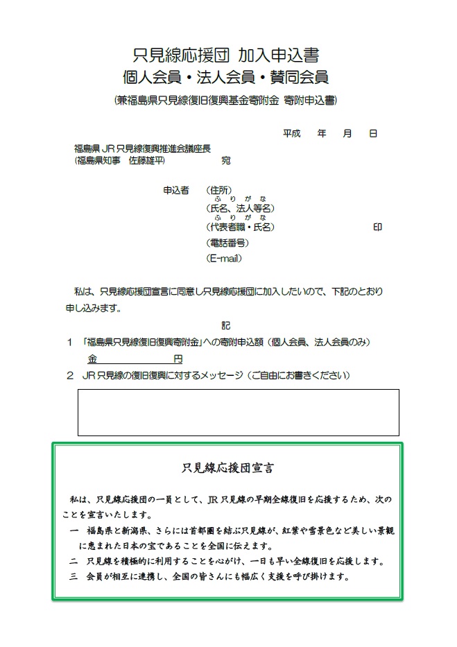 私は、只見線応援団の一員として、JR只見線の早期全線復旧を応援するため、次のことを宣言いたします。 一 福島県と新潟県、さらには首都圏を結ぶ只見線が、紅葉や雪景色など美しい景観に恵まれた日本の宝であることを 全国に伝えます。 二 只見線を積極的に利用することを心がけ、一日も早い全線復旧を応援します。 三 会員が相互に連携し、全国の皆さんにも幅広く支援を呼び掛けます。 |