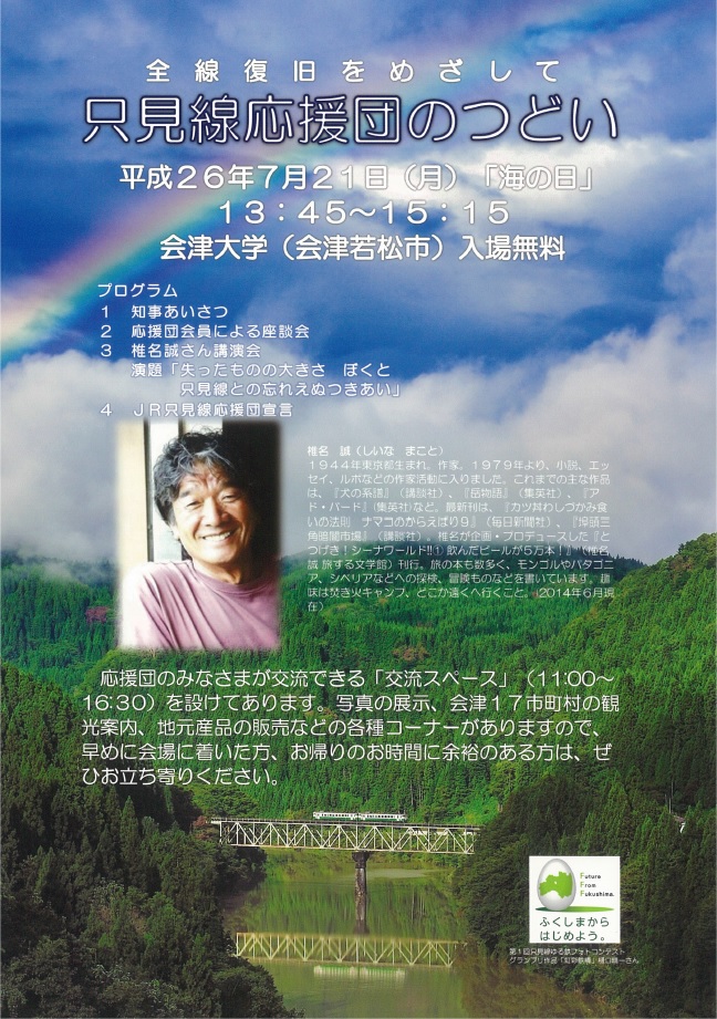 【プログラム】 1.知事あいさつ 2.応援団会員による座談会 3.椎名誠さん講演会 演題「失ったものの大きさ ぼくと只見線との忘れえぬつきあい」 4.JR只見線応援団宣言