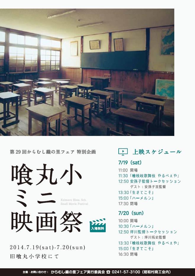 7月19日~20日に開催される”からむし織の里フェア”に合わせて「喰丸小ミニ映画祭」が開催されます。 昭和村が舞台となり話題を呼んだ”ハーメルン”や、安孫子亘監督作品の”やるべぇや””生きてこそ”の3本が上映されます。 19日には安孫子監督、20日には坪川監督が来場します!からむし織の里フェアにあわせてご来場ください。