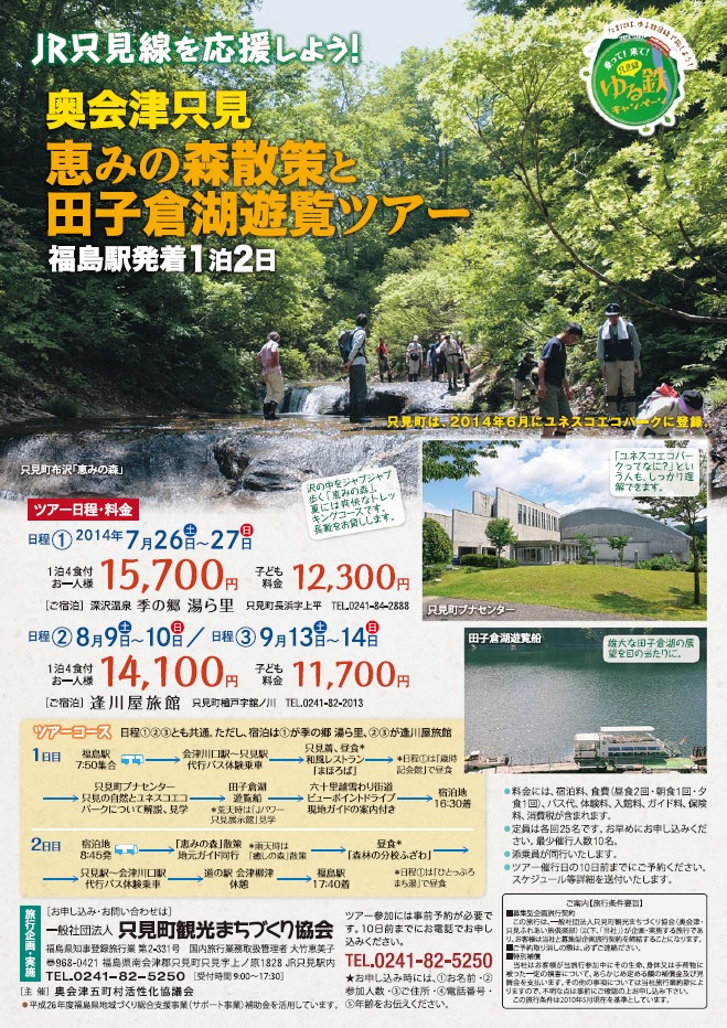 只見線を応援しながら、ブナ林「恵みの森」を歩き、雄大なダム湖の田子倉湖などを散策して只見町を満喫できるツアーが7~9月の間に3回開催されます。お得なツアーです!この機会ぜひご利用ください♪ |