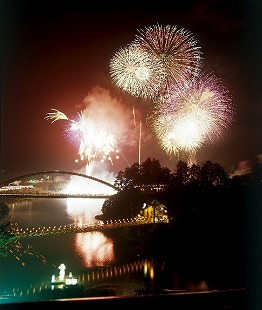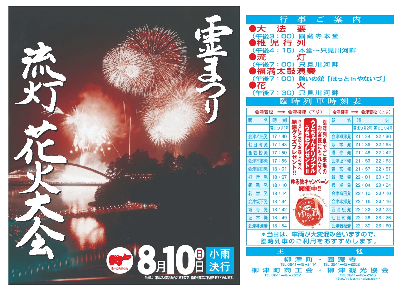 8月10日、福満虚空藏菩薩圓藏寺で亡き霊の法要の為に大法要を催した後、稚児たちが流灯を持って圓藏寺本堂から只見川の魚淵まで歩きます。只見川には流灯を浮かべられ、夜空には4,500発の盛大な花火が打ち上げられます。山に反響する音と光を楽しめる花火大会にぜひお越しください!