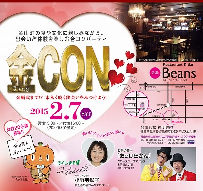 ■会場:Restaurant & Bar Beans 福島県会津若松市栄町2-25アビスビル1F(神明通り) ■参加条件(お一人でも参加可能) 【女性】未婚女性20名募集(20歳~40代まで) 参加費2,000円(税込) 申込締切:2015年2月2日(月)