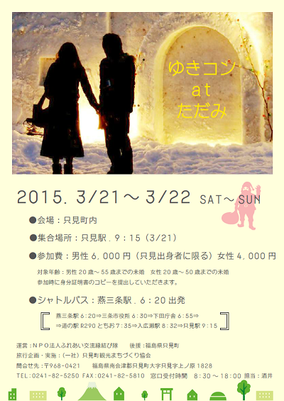 ■開催日 : 2015/3/21(土)~3/22(日) ■会場 : 只見町内 ■集合場所 : 只見駅 9:15 ■参加費 : 男性 6,000円、女性 4,000円 ■対象年齢 : 男性 20歳~55歳までの未婚者(只見出身者に限る) 女性 20歳~50歳までの未婚者 ※参加時に身分証明書のコピーを提出していただきます。