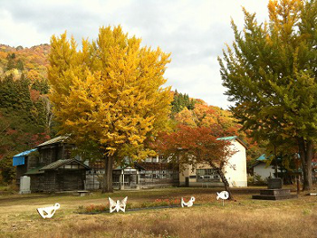鮮やかなイチョウと、どこか懐かしさを感じさせる木造校舎。現在は廃校になっていますが喰丸(くいまる)小学校です。