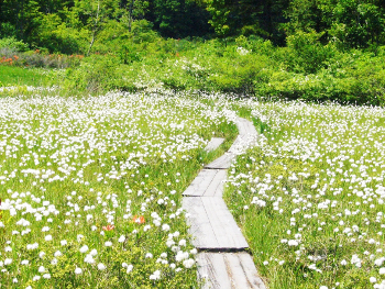 尾瀬よりも手軽に湿原に咲く花々を楽しむことができ、6月下旬から7月上旬のワタスゲの時期には多くのハイカーが訪れます。