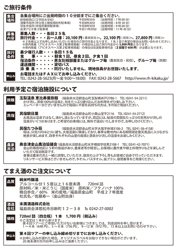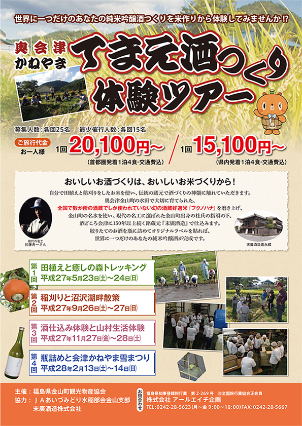 奥会津金山町で、幻の酒造好適米「フクノハナ」を使ったあなただけのオリジナル純米吟醸酒が作れる「てまえ酒つくり体験ツアー」が年4回にわたって行われます。