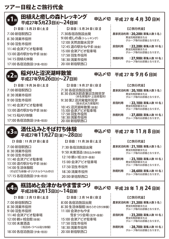 お一人様:20,100(農家民泊)~、22,100(民宿)~、27,800(旅館)~
