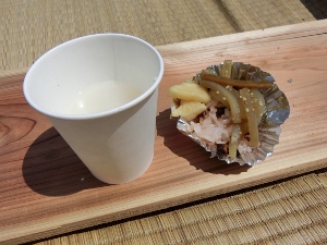 おもてなしの甘酒とお赤飯、お漬物をいただきました。山歩きで疲れた体にとても嬉しいおもてなしです。美味しくてスタッフもぺろりと完食しました。