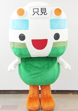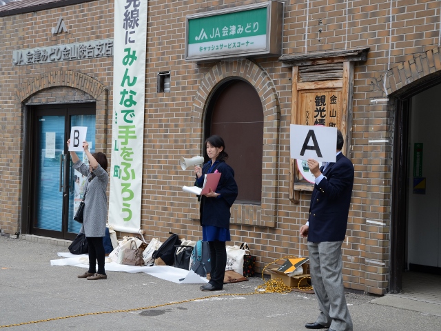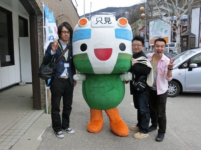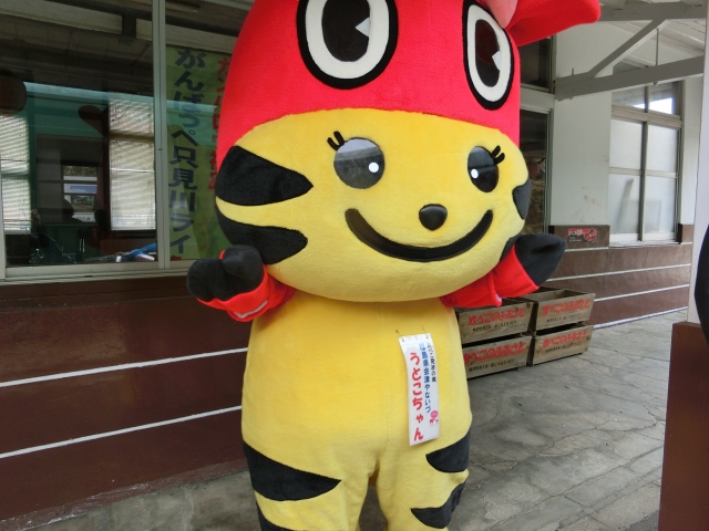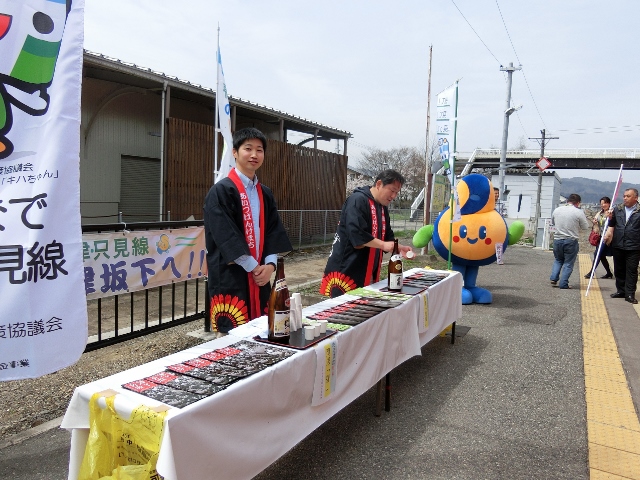 会津坂下駅では坂下町のゆるキャラ“バンビィ”が振舞い酒でお出迎え。