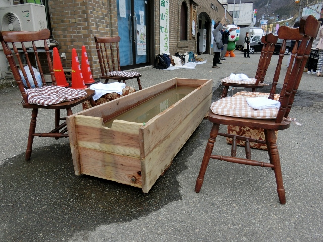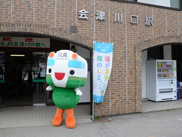 会津川口駅では、只見線のゆるキャラ“キハちゃん”と玉梨温泉から汲んだ足湯でお出迎え~。
