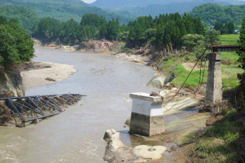ところが、JR只見線は2011年の7月に発生した新潟・福島豪雨災害により橋梁(鉄橋)が崩落し、会津川口駅と只見駅間で現在も運休が続いています。第五・第六・第七と、3本もの橋梁が崩落したため、この区間の復旧にかかる費用は85億円とされています。費用の大きさに加え、もともと赤字路線だったこともあり、復旧の見通しは全く立っていないのが現状です。右のマイクロバスは、会津川口駅と只見駅を往復する代行バスで、沿線のみなさんの生活を支えています。