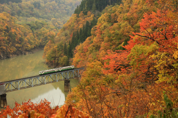 只見川と橋梁と赤や黄色に彩られた山々と列車。雪煙をあげて豪雪地帯を走る列車。四季折々の美しさは、多くの人を魅了します。