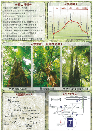 志津倉山は三島町、昭和村、柳津町に境を接し、全山ブナに覆われています。国道252号線から志津倉山登山口まで約16キロあり、奥深い、静かな山です。特徴は、巨大なスラブの雨乞岩や不気味な猫啼岩、目も眩むほどの屏風岩など岩場など多く、伝説のある山です。