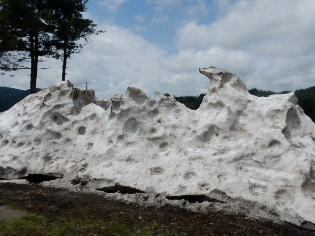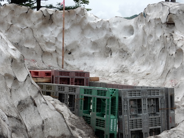 雪室はこのようになっています。雪むろまつりの前の数日間雨が降ったので小さくなっていますが、元はかなり大きな雪の塊だったそうです。