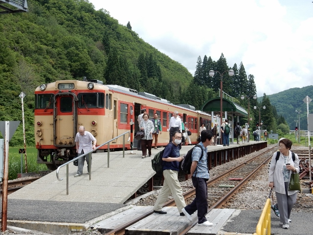 会津若松駅 7:37発==(JR 只見線)==会津川口駅 9:39着 10:25発==(JR 代行バス)==会津川口駅 11:15着