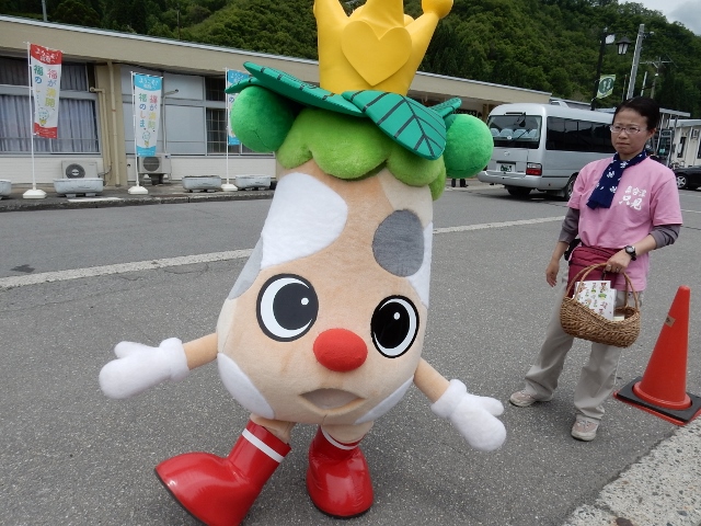 只見山菜満喫号もやって来ました。会場のみなさんで手を振ります。只見町のゆるキャラ「ブナりん」も登場し、列車を出迎えていました。