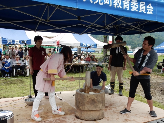 雪室で貯蔵したもち米を使った餅つきも行われました。みなさん力を込めてついています。