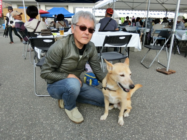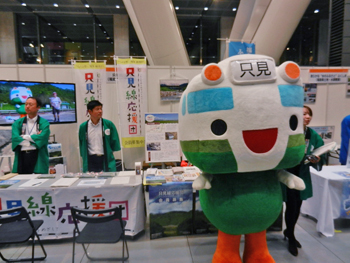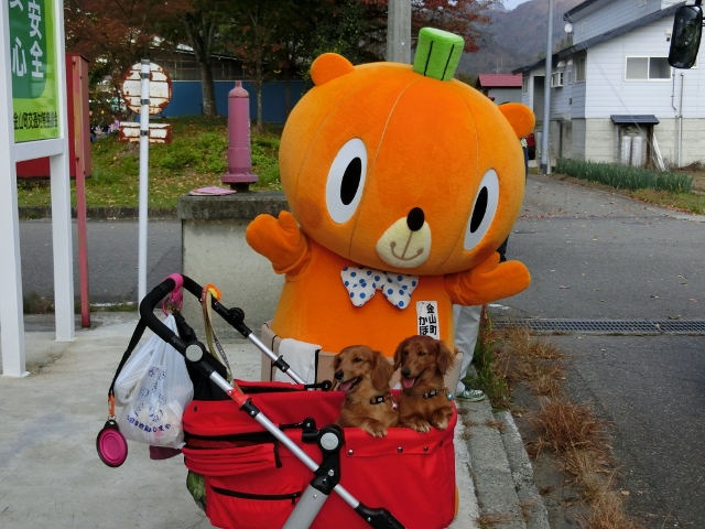 金山町のゆるキャラ、かぼちゃの妖精「かぼまる」が歓迎してくれました。ワンちゃんも楽しそうです。