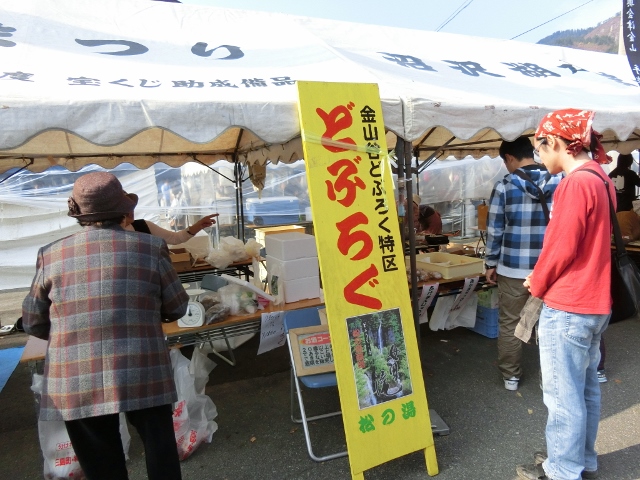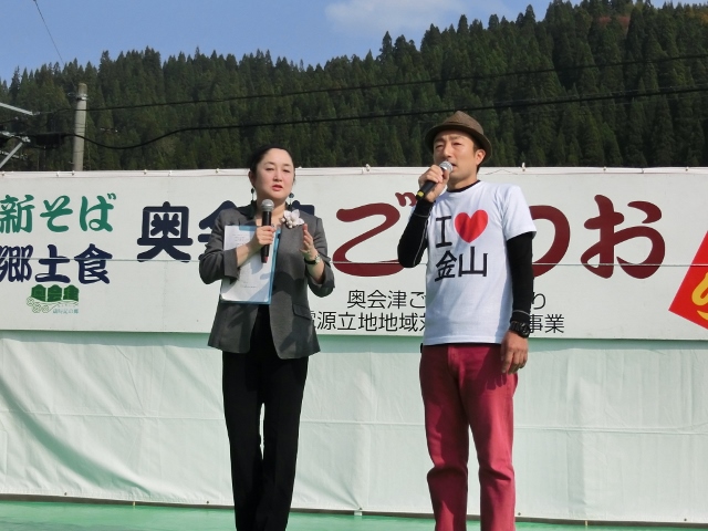 出店はどれも大盛況でした。新そばやどぶろくなど奥会津ならではのごっつおが並び、ステージでは「アイラブ金山」Tシャツの宣伝などが行われていました。