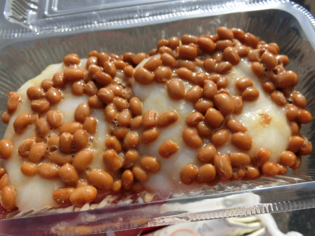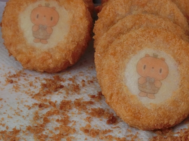 かぼまるがプリントされた、なんとも可愛らしい「かぼまるコロッケ」。中身はほくほくして甘いかぼちゃコロッケです。揚げたて熱々をいただきました。つきたての納豆餅も柔らかく、大変おいしくいただけました。
