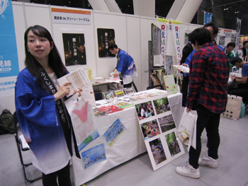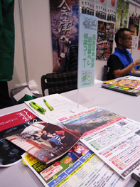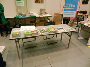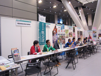 入口付近というベストな位置で、奥会津関連のパンフレット類を来場者の皆さんにお渡し。
