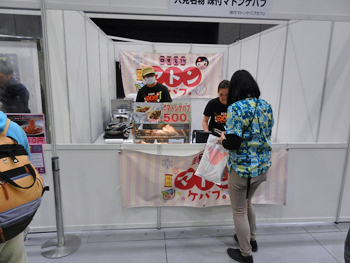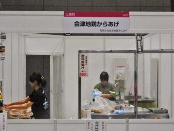 会場内でもひときわ熱気を帯びていたのは、やっぱりグルメエリア。福島県自慢のご当地グルメの店が軒を連ねました。奥会津からは三島町の会津地鶏からあげ、只見町のマトンケバブ、柳津町の柳津ソースカツ丼とあわまんじゅうが出店。