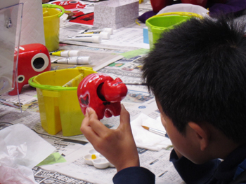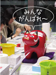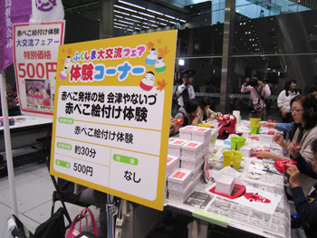 体験コーナーも親子連れなどで大にぎわい。皆さん楽しそうに手を動かしています。中でも赤べこの絵付けは大人気!男の子も真剣に顔を描き込んでいます。