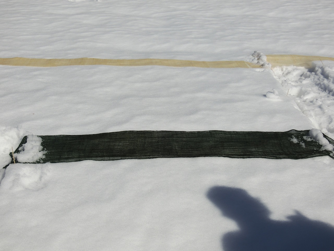 水に浸してあるからむし織をゆっくり広げながら、雪の上にさらしていきます。両端は風で飛ばされないように雪を乗せおさえていきます