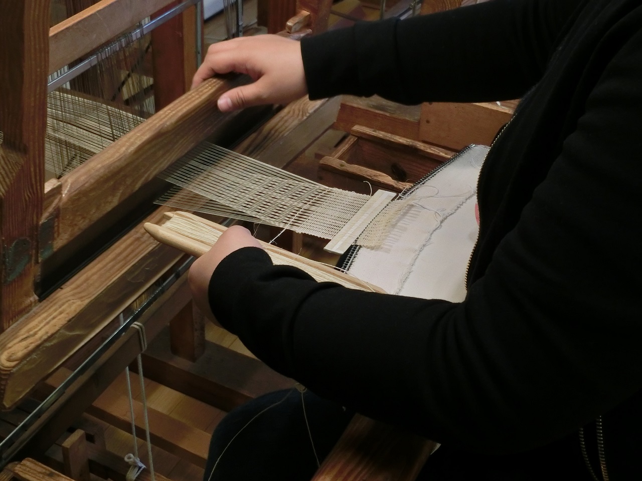 糸を作っているところ。繊維を一本一本指で捻りながら繋い 機織りをしているところ。簡単そうに見えますが...熟練の技です