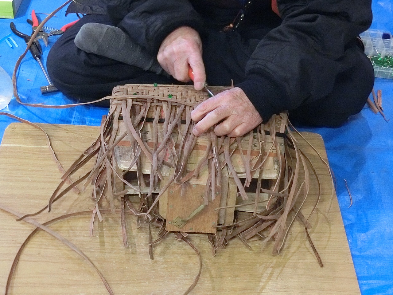 手提げ籠を編んでいるところ。しっかりした素材です 『コースター作り』体験! ドキドキ ♪ わくわく ♪