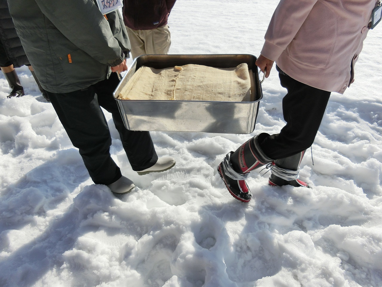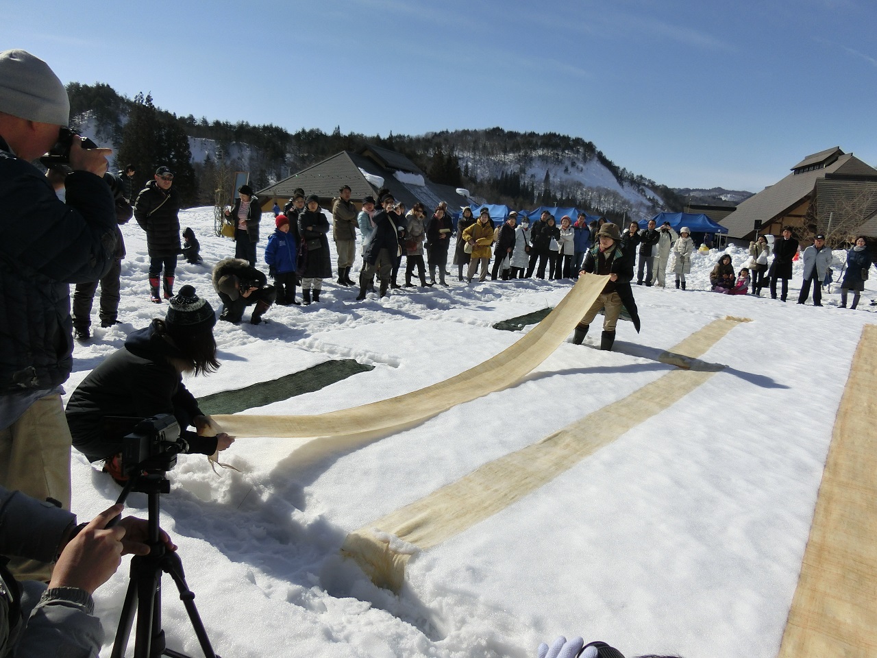 水に浸してあるからむし織をゆっくり広げながら、雪の上にさらしていきます。両端は風で飛ばされないように雪を乗せおさえていきます