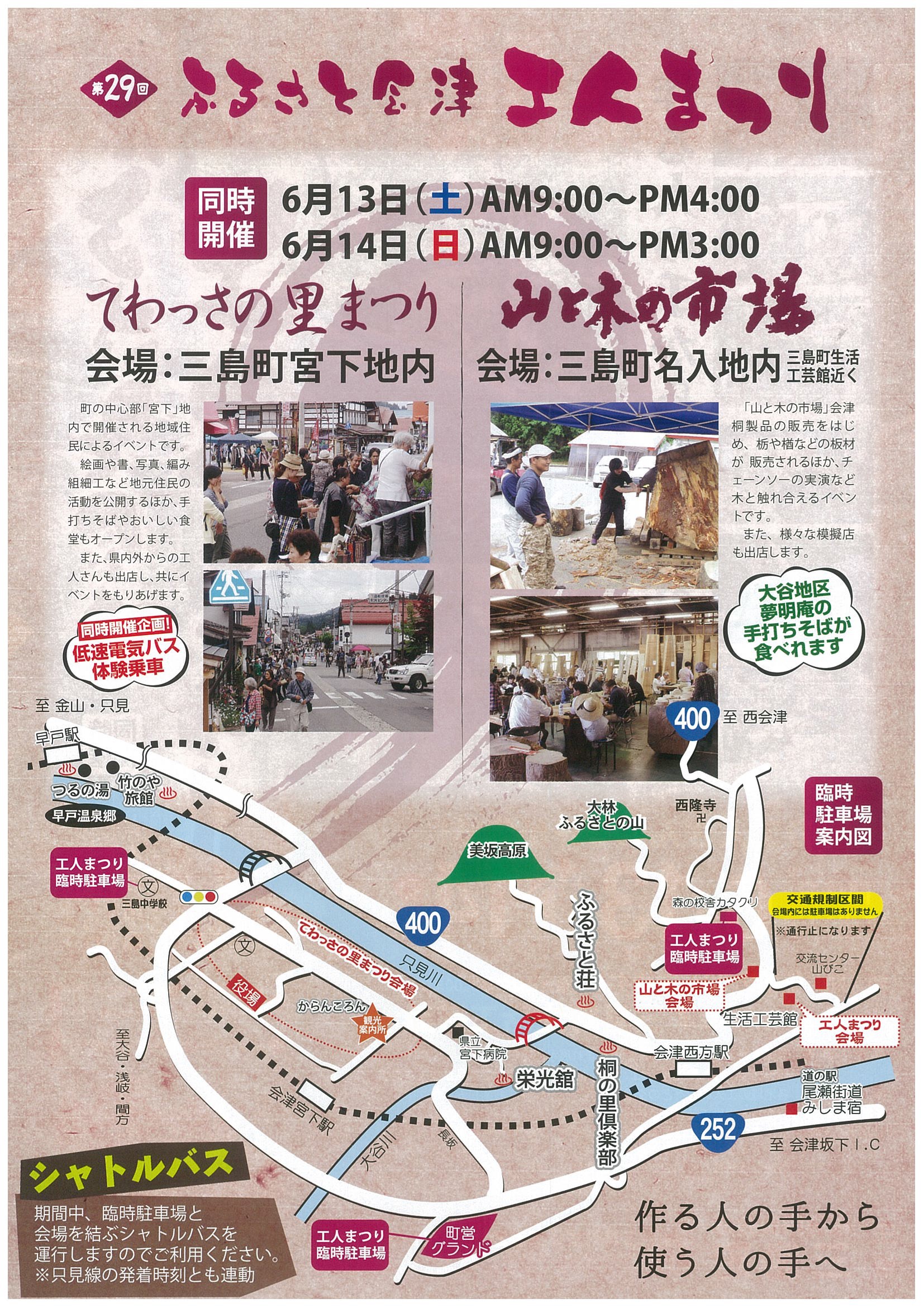 工人まつり会場から“てわっさの里まつり”、“山と木の市場”の会場まで随時シャトルバスが出ています。