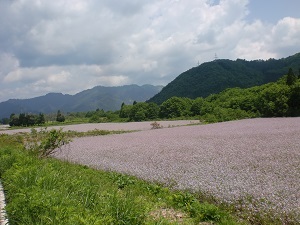 右の写真の花畑は金山町の特産品でもある「アザキ大根」で、5月中旬からが見ごろです。