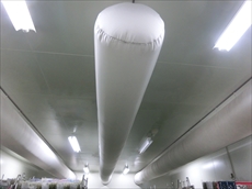 これが温度を調節するダクトです。冷たい風をそのままではかすみ草が傷んでしまうので、布を使い、やさしい風が布の間を抜けて涼しくなります。この奥にミキシングルームがあり、外気を取り込むための外気導入ファン、各空間の空気を循環させるための経路と空調ファンを備え、外気を室内へ取り込んで冷却をおこなう外気冷却システムにおいて、室内外の差圧センサーで所定値以下となるように制御しています。