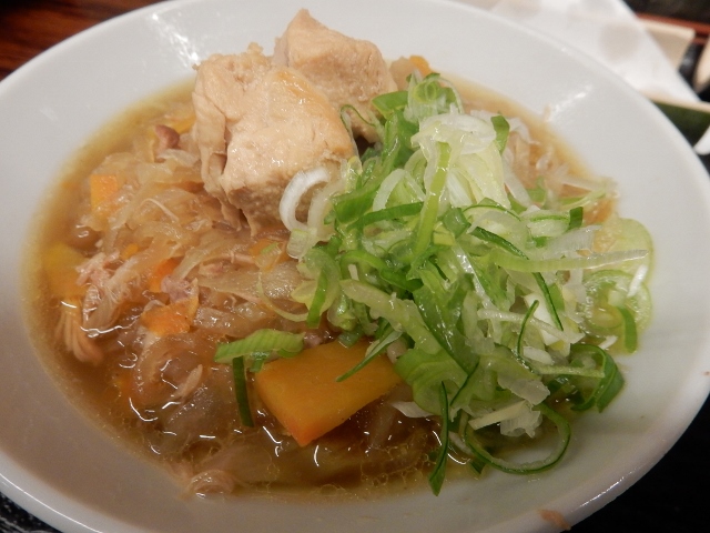 新そばは温かいものと冷たいものが食べ放題、薬味はアザキ大根とわさびとネギがあります。