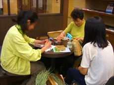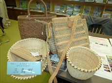 三島町からは、編み組細工指導員の角田キイ子さんに来ていただき、使用する原料(山ブドウ、ヒロロなど)を持参し、会場でストラップやバックを編んでいただきました。