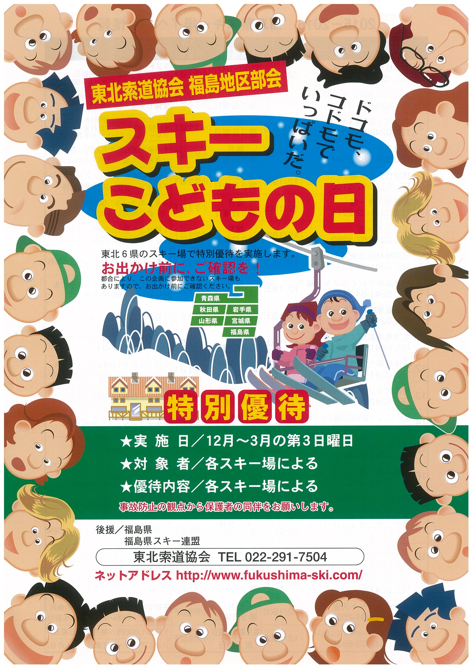 12月から3月までの第3日曜日は「スキー子どもの日」です。 毎月第3日曜 小学生以下 ・リフト1日券1,200円を700円に割引きになります。(スキー大会・イベント時は適用外) |