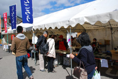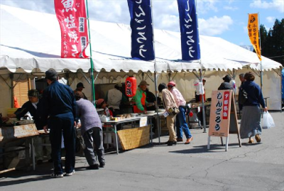 おそばを食べておなかが満たされたところで、国道を走っていると、いつも取材やツアーなどでお世話になっている下郷町物産館さんに何やら出店(でみせ)が!観光で訪れるお客様向けに、下郷町の郷土食「しんごろう」やイワナの塩焼きなどをその場で作って販売していました。店頭にはこれから地元の農産物などが山もり並ぶ予定ですのでみなさまもぜひお立ち寄りくださいね。