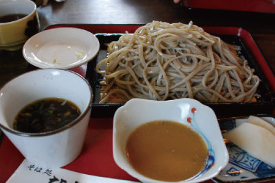 なかいさんのもりそばは、下郷特産のじゅうねん(エゴマ)を使ったタレと通常のつゆの2種類の味で楽しめるのが特徴です。じゅうねんのタレのほうは 塩気は入っておらず、つゆをお好みでじゅうねんタレに足してからいただきます。じゅうねんタレはほんのり香ばしいかおりがします。おそばは噛みごたえが あって、口の中で十分にそばの風味を味わえます。写真が若干食べかけなのはご愛嬌~これも写真撮るの忘れて食べちゃってました(汗)