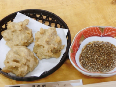 「道の駅番屋」は、国道352号線沿いに面しており、平成22年10月には「道の駅」に指定を受け、年間を通してご利用頂けるようになりました。ここで、スキー場情報、登山の情報など観光情報を入手しながら、食事やお土産品の購入、トイレ休憩などに立ち寄ることができます。舘岩の特産品は、「「そば」「赤かぶ」「南郷トマト」などがありますが、お食事は、そばメニューが中心です。ここのそばは、標高の高い所でとれたそばでを使っていますので、風味や歯ごたえはバツグン!!「ざるそば」でも「温かいそば」でも美味しくお召上がり頂けます。最近、高級食材として人気の「行者ニンニク」の生産にも舘岩地区は取り組んでおります。雪解けと共にふき出す葉っぱは柔らかく、お浸し、天ぷら、炒め物などで美味しく頂けますが、この「行者ニンニク」の葉を使った、「餃子」の生産にも取り組んでおり、ここ「道の駅番屋」でお召上がり頂けますので、試して下さい。番屋おすすめの「そばがき」を頂きました。行者にんにくを使ったたれが、香り高く、そばがきとすごく合っていて、とっても美味しくいただきました。